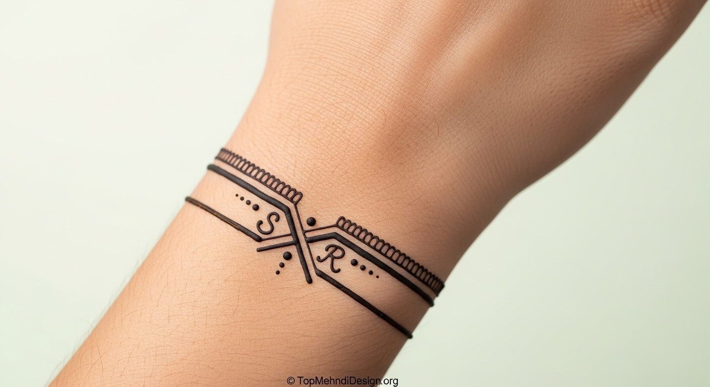 A clean circular band around the wrist with initials, a wedding hashtag, or small geometric patterns. Looks like an elegant bracelet. Perfect for grooms who want mehndi without heavy coverage.