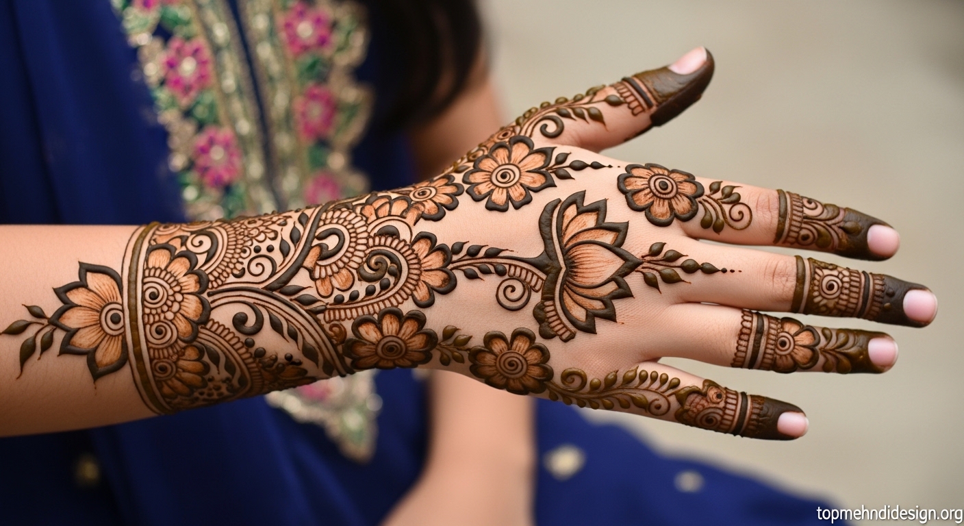 - For school functions, the best back hand mehndi uses a single central motif with light vine extensions not a heavy full-coverage design.